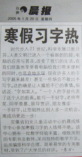 安徽省妇女儿童活动中心的晟成练字中心参加寒假习字的人络绎不绝。该中心拥有一批教学经验丰富、细致周到的专职书法教师,采用独特的教学方法,运用编排科学合理、简单易学的专用教材,受到了广大学员的好评。 |