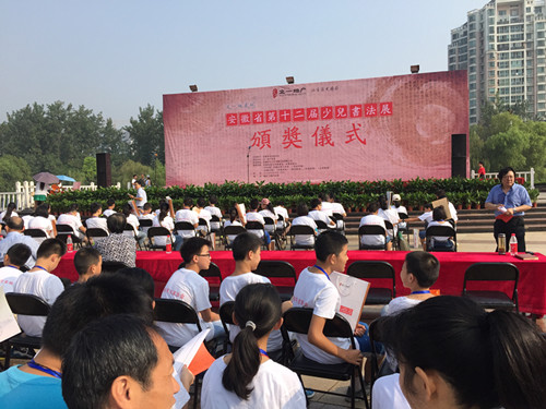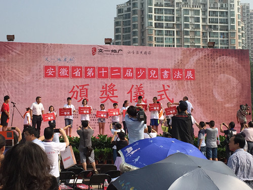 为了全面展示我省少儿的书法教育水平,繁荣我省少儿书法艺术,为倡导“写好中国字,做好中国人”的理念,促进我省少年儿童素质的全面发展。经研究,安徽省书法家协会决定举办安徽省第十二届少儿书法大赛”。本次大赛共计收稿2500多幅,经初评入展作品460幅,从入展作品中评选出100名获奖选手参加现场电视决赛。于8月29日在徽园书法馆举办“文一地产杯”安徽省第十二届少儿书法展现场电视决赛。100名选手经过现场面题书写,评委现场评分,现场点评、现场示范、现场公布比赛结果,最终评选出一、二、三等奖。此次活动媒体全程现场报道,使比赛更加公平、公正、公开。